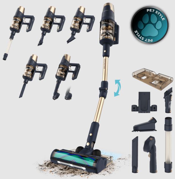 Tubo flexible // Autonomía de 100 min // Potencia succión 30 kPa // Cepillo antienredos // Kit de accesorios completo // Cepillo para animales